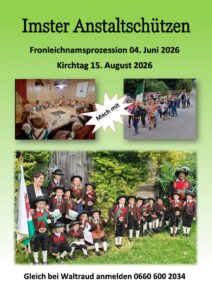Der 15. August ist der höchste kirchliche Feiertag in Imst „Mariä Himmelfahrt“ und zugleich Imster Kirchtag. Für unsere Kompanie ist selbstverständlich diesen Feiertag gemeinsam mit der Pfarre und der Stadt Imst zu gestalten und zu Weiterlesen